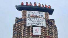 A small boat with several figures wearing lifejackets inside is on top of a banner saying ‘stop the boats’.